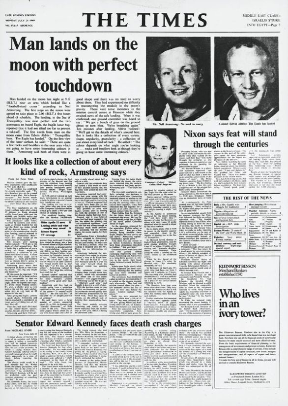 Il quotidiano "The Times" del 21 luglio 1969 Il 20 luglio 1969 l'uomo sbarcò sulla Luna: nel corso della missione gli astronauti Neil Armstrong ed Edwin Aldrin prelevarono 32 kg di campioni di polvere e rocce lunari.