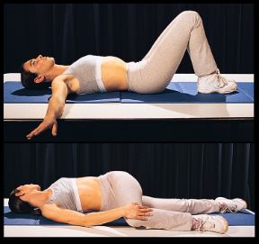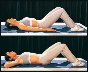 Esercizio per il busto. Movimenti per il busto dalla posizione supina. Contrazione dei muscoli della parte bassa della schiena.