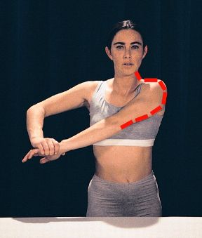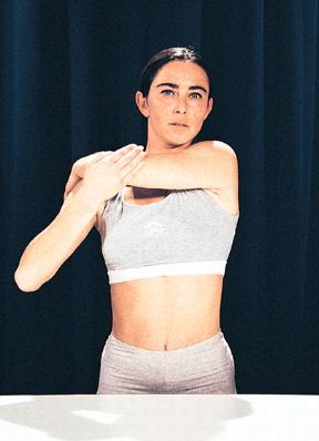 Esercizio per gli arti superiori. Movimenti per gli arti superiori da eseguire in piedi. Un braccio spinto fino a toccare con la mano la scapola opposta.
