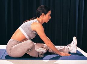 Esercizio per il busto. Movimenti per il busto dalla posizione seduta. Flessioni del tronco con la pianta del piede che aderisce alla parte interna della coscia.