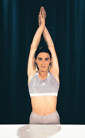 Esercizio per il busto. Movimenti per il busto dalla posizione seduta. Portare le braccia in alto, con le dita incrociate e le palme rivolte all'esterno.