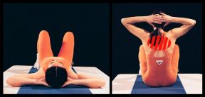 • Da supini a gambe flesse e con le mani dietro la nuca, servirsi di un asciugamano per alleviare la tensione nel sollevare il capo e le spalle; flettere contemporaneamente le gambe fino a far avvicinare ginocchia e gomiti, quindi portare i gomiti in fuori e ritornare lentamente alla posizione di partenza.