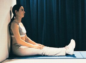 • Appoggiati col dorso alla parete, portare le braccia dal basso verso l'alto, partendo dai fianchi e passando per fuori, con le palme rivolte in avanti e aderendo alla parete.