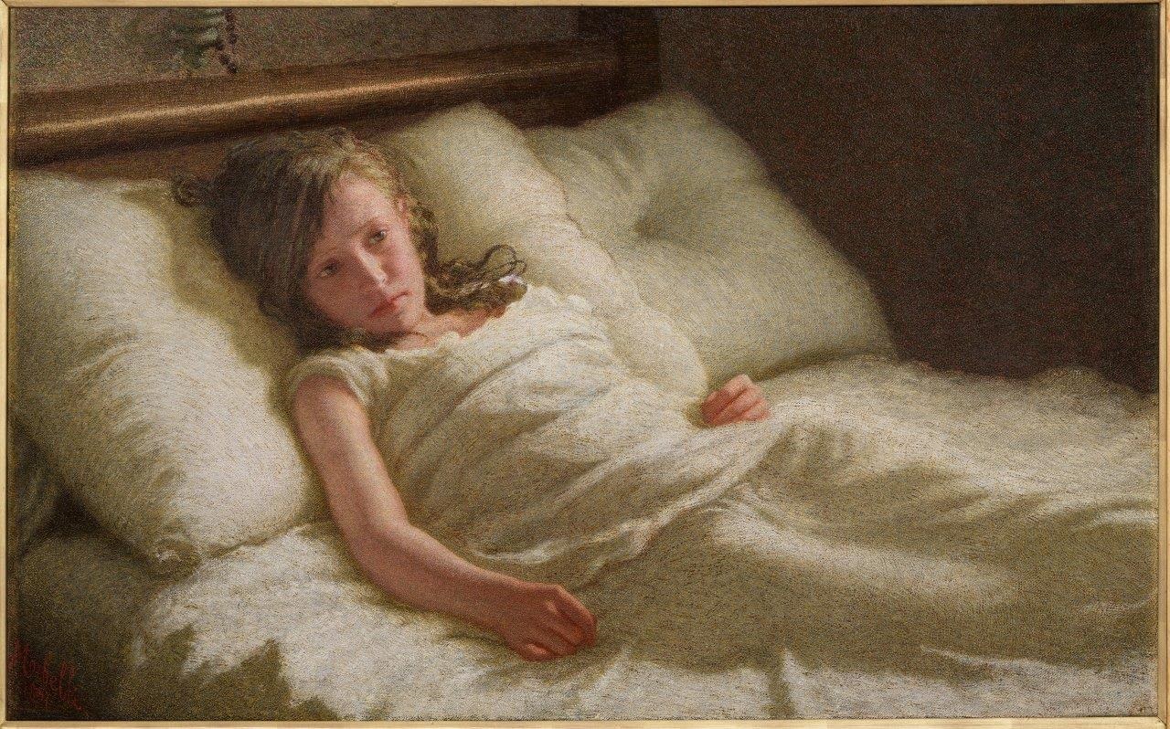 “Alba domenicale” di Morbelli (1915) è stata sostituita con l’opera “Per sempre” (1906), l’ultima delle due tele dedicate al “mal sottile”, la tubercolosi, flagello che allora falciava esseri giovani con una frequenza tale da tradursi nel morboso fascino ottocentesco del “fior reciso”, celebrato in memorabili poemi, liriche, dipinti e sculture. Proprio in quella tematica il dipinto chiude un’era, ma l’artista evita un pathos scontato grazie alla magia del linguaggio divisionista spinto all’intensità estrema, uno dei più puri esempi del divisionismo di Morbelli in cui le particelle di colore polverizzate sulla tela rendono in vibrazione luminosa la dicotomia eternità della natura - caducità della vita umana.