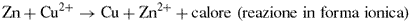 Così, immergendo una lamina di zinco metallico (Zn) in una soluzione di solfato rameico CuSO4, si verifica l'ossidazione di Zn a ioni Zn2+ e la riduzione degli ioni Cu2+ a rame metallico (Cu):
