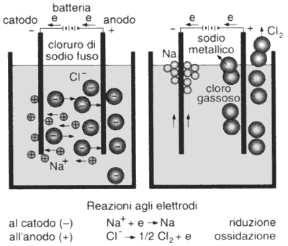Sotto l'azione del campo elettrico generato dagli elettrodi, gli ioni con carica positiva presenti nell'elettrolita (cationi) migrano verso il catodo, quelli di carica negativa (anioni) verso l'anodo; al catodo si verificano reazioni di riduzione, all'anodo reazioni di ossidazione. Se nella cella è presente un elettrolita fuso, per esempio, cloruro di sodio (NaCl), agli elettrodi si verificano le seguenti reazioni (v. fig. 15.2):