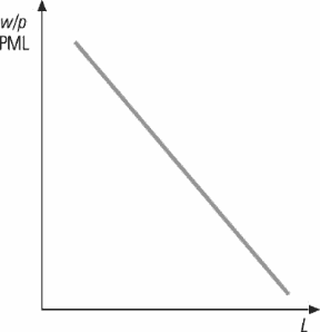 La funzione di domanda di lavoro descrive la relazione esistente tra livello del salario reale (dato dal rapporto tra salario nominale e livello dei prezzi, in formula: w/p) e occupazione (L) per un dato livello di capitale e una data tecnologia. Nella fig. 15.1 è decrescente in virtù dell'ipotesi di produttività marginale del lavoro (PML) decrescente: dato il livello del capitale investito e della tecnologia, ogni unità aggiuntiva di lavoro impiegata nella produzione avrà una produttività positiva, ma decrescente. La scelta ottimale da parte dell'impresa è quella di assumere lavoratori fino a quando la PML eguaglia il salario reale. Di conseguenza, tanto maggiore è il livello del salario reale, tanto minore sarà il lavoro domandato. Il livello di capitale installato nell'impresa e la tecnologia da essa adottata influenzano, invece, la posizione della curva di domanda di lavoro. Infatti, se aumenta la quantità di capitale installato, ciascuna unità di lavoro ha a sua disposizione una maggiore quantità di capitale e risulta dunque più produttiva. Per ogni livello del salario reale viene quindi richiesta una maggiore quantità di lavoro; ciò viene descritto graficamente con uno spostamento della curva di domanda di lavoro verso l'alto. Analoga considerazione vale per il miglioramento della tecnologia adottata dall'impresa, che aumenta il livello della PML.