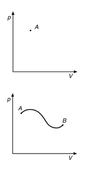Un sistema termodinamico si trova allo stato di equilibrio termodinamico quando le tre grandezze che lo caratterizzano sono costanti nel tempo. Un gas perfetto in un recipiente chiuso, isolato dall'esterno, per il quale vale l'equazione di stato dei gas perfetti, si trova allo stato di equilibrio. Se però il recipiente che contiene il gas è chiuso da un pistone, alzando o abbassando il pistone il gas subirà una trasformazione termodinamica, dove la sua pressione varia (aumenta o diminuisce) e solo dopo un determinato periodo di tempo si ristabilisce l'equilibrio. Una trasformazione termodinamica è caratterizzata dal passaggio di un sistema termodinamico da uno stato iniziale (che chiameremo A) a uno stato finale (che chiameremo B), attraverso una successione di stati intermedi. Una trasformazione di questo tipo viene in genere rappresentata su un piano cartesiano riportando in ascissa i valori del volume V del sistema e in ordinata i valori della pressione p del sistema. Un sistema in equilibrio è rappresentato da un punto nel piano pressione-volume (o piano p,V), mentre una trasformazione è rappresentata da una linea, o da una successione di linee, che porta il sistema da un punto a un altro (v. fig. 14.1).
