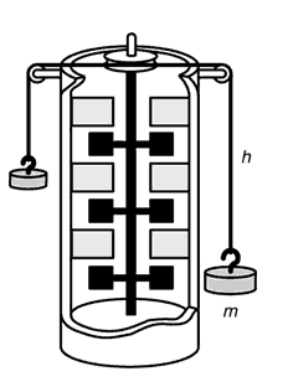 Figura 14.2 Il mulinello di Joule, costituito da un calorimetro che non permette scambi di calore con l'esterno, e da un albero a pala, che viene mosso meccanicamente dalla caduta del peso.
