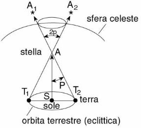 La parallasse è lo spostamento apparente della posizione di una stella, rispetto a uno sfondo, causato da un cambiamento nella posizione dell'osservatore, dato dal moto di rivoluzione terrestre. Essa corrisponde all'angolo, nel cui vertice si trova l'astro osservato, sotto il quale è vista la linea di base congiungente altri due punti (Sole e Terra). La parallasse per le stelle ha valori sempre molto piccoli, 0,7" (secondi d'arco) per la stella più vicino a noi (Proxima Centauri). Quanto più lontana è una stella, tanto più piccola è la sua parallasse.