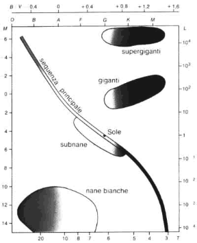 Figura 2.1 Nel diagramma di Hertzsprung-Russell la temperatura superficiale delle stelle è messa in relazione con la loro luminosità. Il diagramma H-R è alla base della teoria dello sviluppo delle stelle, dalla loro formazione alla loro estinzione.