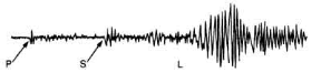 Procedendo da sinistra verso destra nella lettura di un sismogramma, si notano prima lievissime oscillazioni dovute al continuo tremolio del suolo per cause diverse da un sisma (per esempio, il traffico, il frangersi delle onde sulle coste ecc.); poi si osservano oscillazioni più evidenti, che indicano l'arrivo delle onde P, seguite dalle onde S (segnalate da un improvviso cambiamento dell'ampiezza dell'oscillazione) e infine dalle onde L (che provocano oscillazioni di ampiezza maggiore delle precedenti).